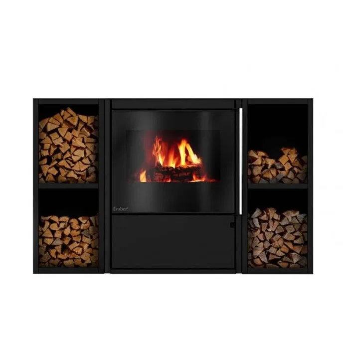 Son grand foyer une sa grande porte permettent de brûler des bûches de 50 cm. Sa base dissimule une niche à bois fermée par une porte. Il peut être complété par des étagères à bûches parfaitement ajustées à ses dimensions. Vous pourrez utiliser celles-ci verticalement ou horizontalement (elles servent alors volontiers de banc)