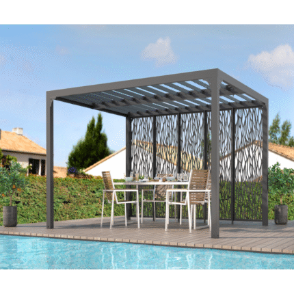 Cette magnifique pergola autoportante Messina couvre plus de 10m² pour accueillir un salon de jardin ou pourquoi pas un spa ou un jacuzzi. Elle est réalisée en aluminium pour la structure et en acier galvanisé pour la double toiture.